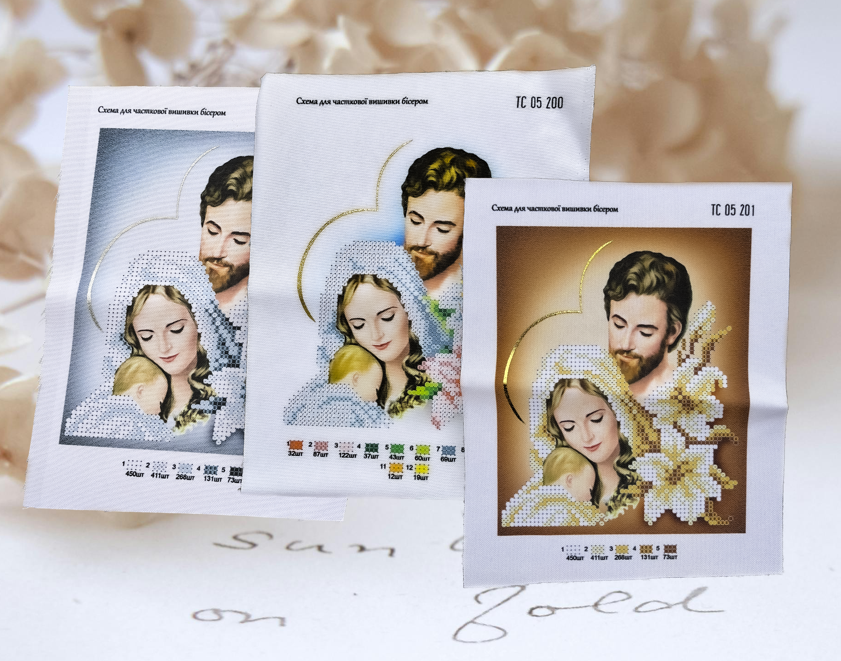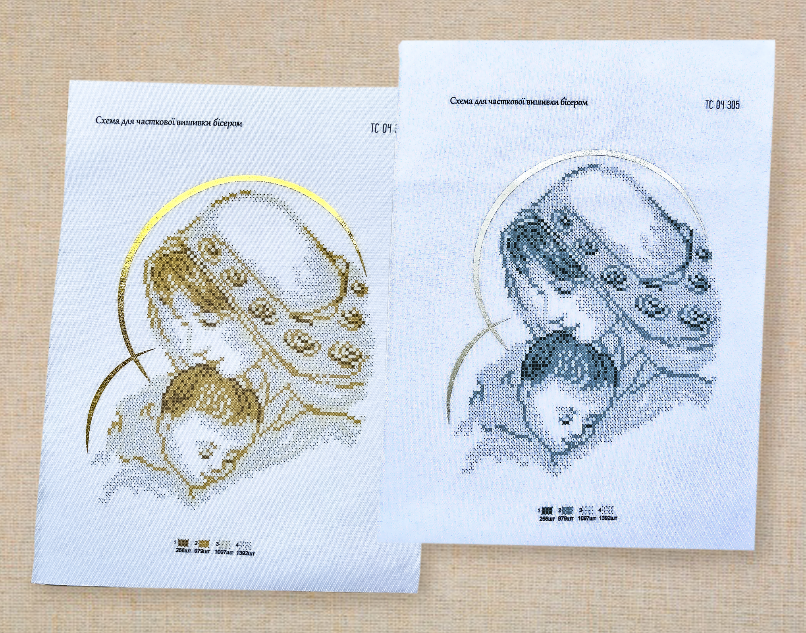 Схеми надруковані на габардині , підклеєнному флізеліном. Деякі елементи зображення в цих схемах надруковані золотою або срібною фарбою , текстильною фольгою. Ціна схем А4 – 50 грн. А5 – 35 грн.